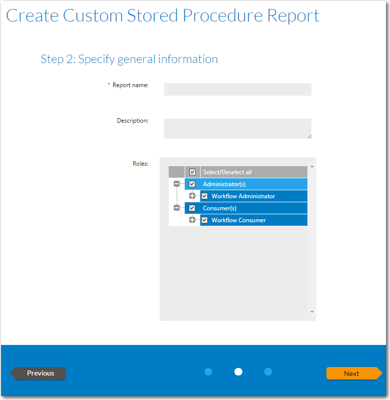 2. In the navigation bar, click Create Custom Stored Procedure Report on the Reports menu. The Step 1: Select Stored procedure of the Create Custom Stored Procedure Report page opens.