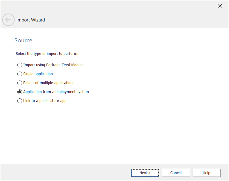 3. In the Source panel, select Packages from a deployment system / Application from deployment system and click Next. The Source Server Details panel opens.