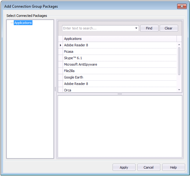 Select Connected Packages treeExpandable tree listing the groups in the Application Catalog. When you select a group, all of the applications in the group are listed in the Applications list.