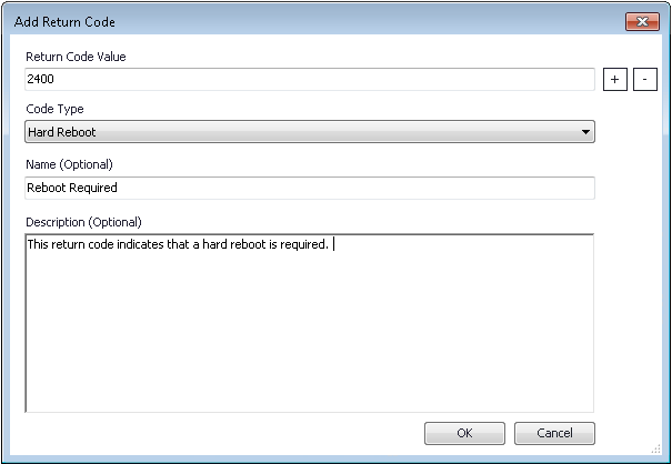 | Return Code Value | Enter a unique value. The following return codes are populated by default during import: • 0 —Success (no reboot) • 1707 —Success (no reboot) • 3010 —Soft Reboot • 1641 —Hard Reboot • 1618 —Fast Retry When you are editing an existing return code, this field cannot be edited. |