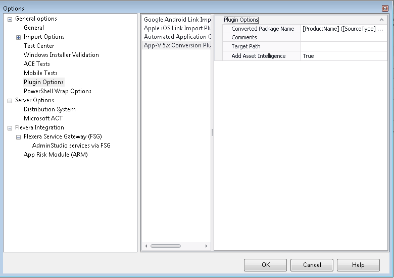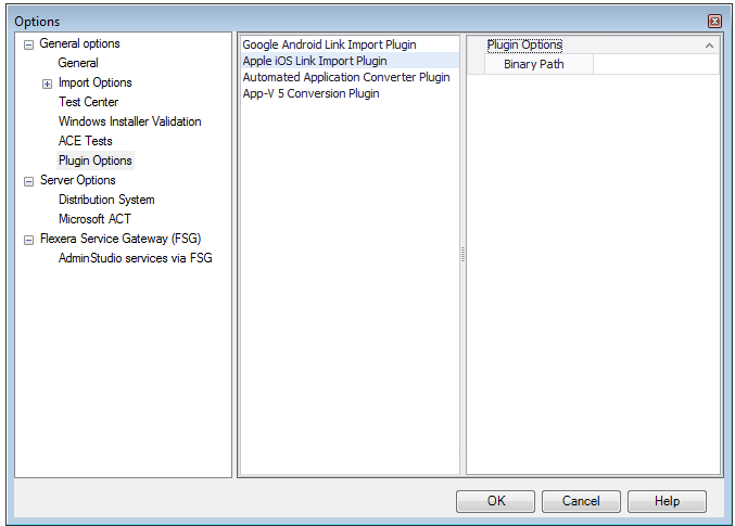 On the Plugin Options tab of the Application Manager Options dialog box, you can specify options for AdminStudio plug-ins including the import of Google Android and Apple iOS public store apps, Automated Application Converter, App-V 5 conversion, and Microsoft Intune conversion. The Plugin Options tab includes the following subtabs.