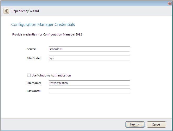 | Use Windows Authentication | Select this option if you want to use Windows network authentication (your network login ID) to log into this Microsoft Configuration Manager Server. |