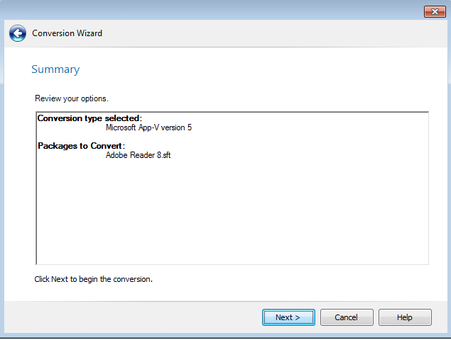 1. Set App-V 5.0 conversion options, as described in Setting App-V 5.0 Conversion Options.