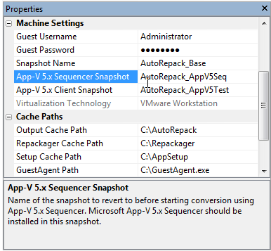 In the Properties window under Machine Settings, enter the name of this snapshot in the App-V 5.x Sequencer Snapshot field.