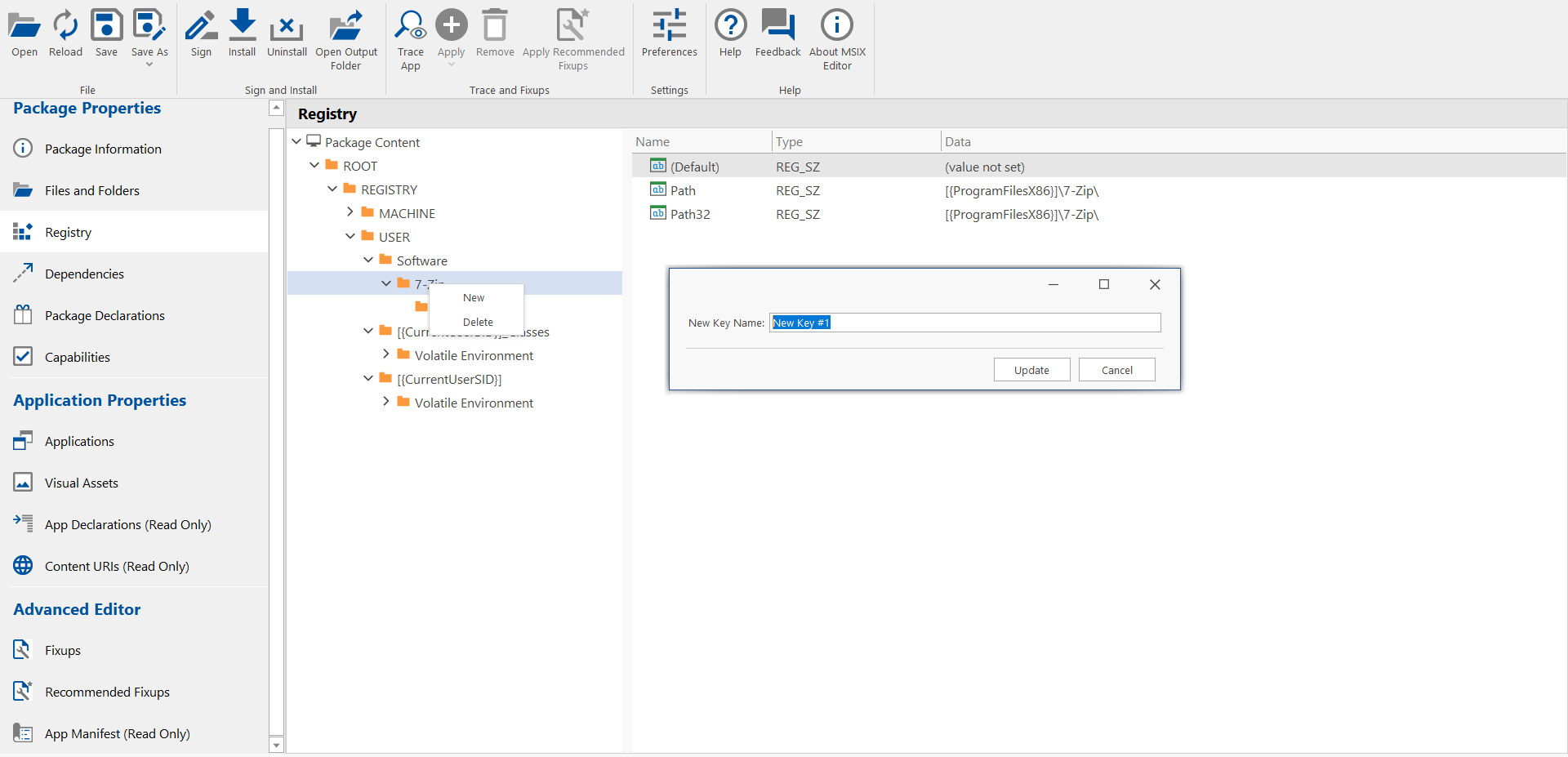 4. Upon saving, the new registry key will be added to the selected MSIX package.